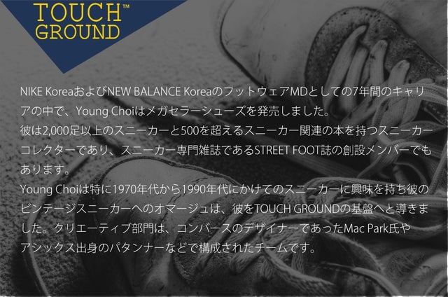 2014年に創業した「タッチグラウンド」のコンセプトは、創業者がこよなく愛する1970-1990年代にかけてのヴィンテージスニーカーを現在にオマージしたコレクションの提案です。クリエーターチームには、Nike、New Balanceにて企画MD、またCONVERSEでのデザイナー実績のあるスタッフが揃っていますが、「タッチグラウンド」の感性を実現するための生産能力が必要でした。その時偶然にもFILA Koreaのプロダクトチームと出会い、2つのチームのスニーカーへの情熱からTOUCH GROUNDの生産ラインが確立され、コラボレーションから2年後に「Vintage Rookie」は生まれました。