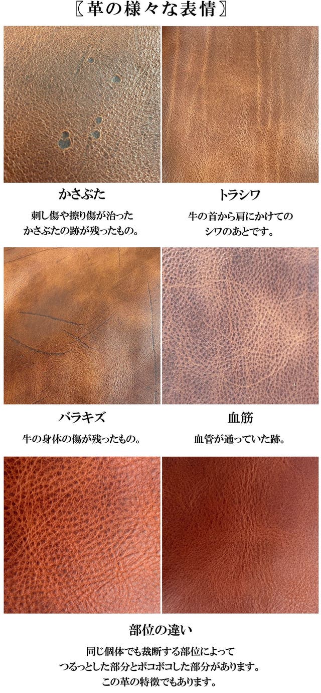 元々の素材を生かした仕上げの為、その牛が持っていたキズ、シワ、血管、毛穴などの天然の刻印がよくみられるのが特徴です。