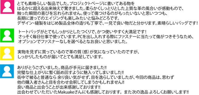 ※予告無く仕様変更をする場合があります。 ※ステッチの周囲にミシンの押さえ跡が付いている場合があります。予めご理解・ご了承の上、ご購入よろしくお願い致します。 ※モニター環境により、実際の商品の色合いと異なって見える場合がございます。 ※応援購入の数が上回った場合、材料の確保や製造工程上の都合等により出荷時期が遅れる場合がございます。 ※本プロジェクトを通して想定を上回る皆様からの応援購入を頂き、現在進めている環境から量産体制を更に整える事ができた場合、正規販売価格より下がる可能性もございます。 ※本文中に記載させていただいたスケジュールは、あくまでプロジェクト公開時点の予定です。応援購入の性質上、配送遅延のおそれがございます。 原則として、配送遅延に伴う応援購入のキャンセルはできませんが、リターン配送予定月から3ヶ月を超えた場合には、希望者に限りキャンセルにて対応させていただきます。