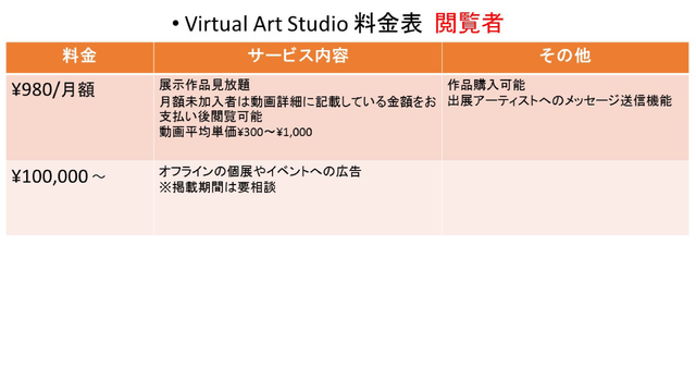 ・Virtual Art Studio作品出展権利(レンタル個展にて団体展示致します。一人10作品まで)期間はサービス開始後1ヶ月