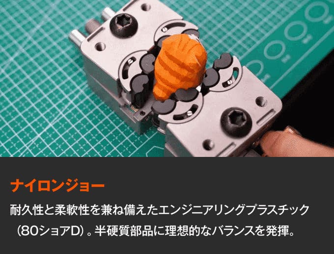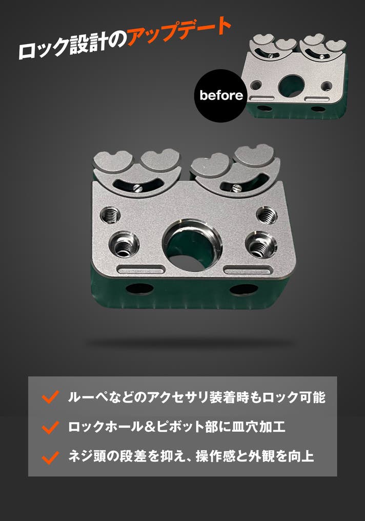 - 三層フラクタル構造とGr5チタン採用。剛性かつ軽量で複雑形状も正確にホールド。