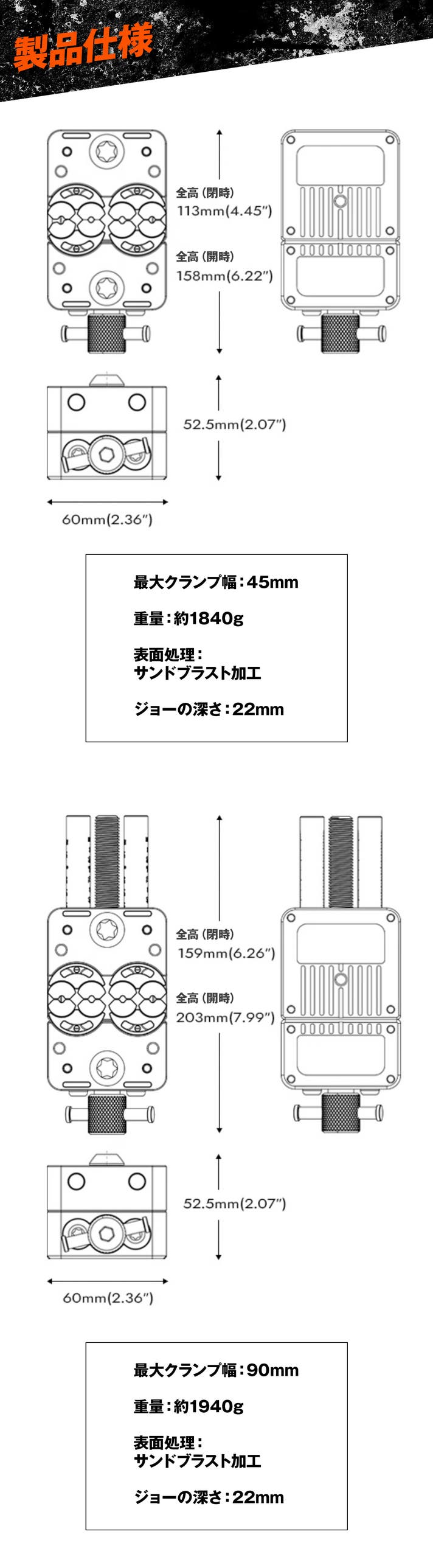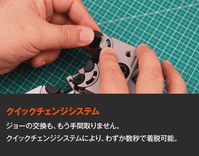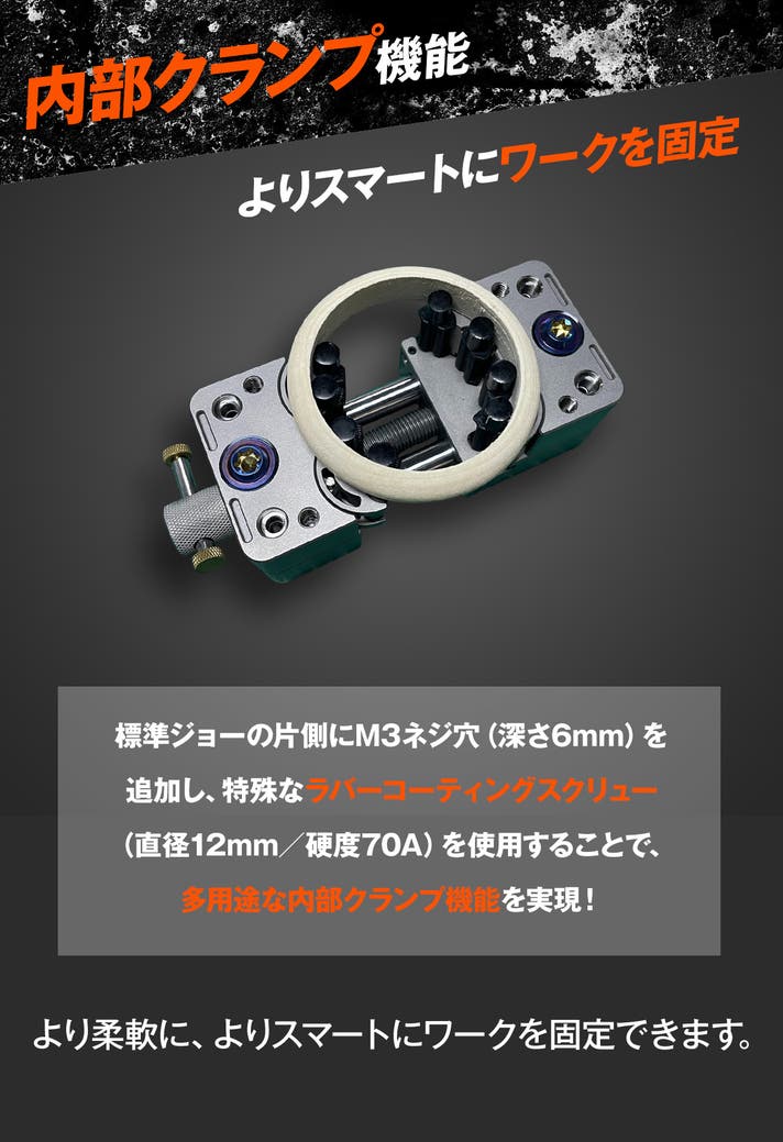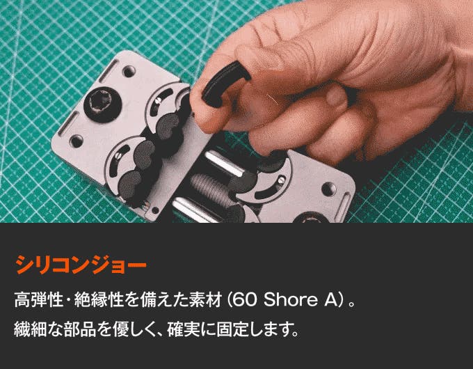 - 4種類のジョー素材と多彩な拡張アクセサリー。作業に合わせてカスタマイズ可能。