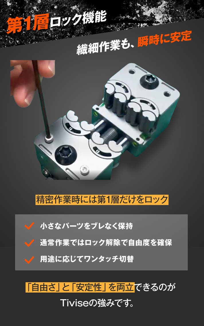 - 第1層ロック機能と最適設計。繊細作業も安定し、アクセサリー装着もスムーズ。