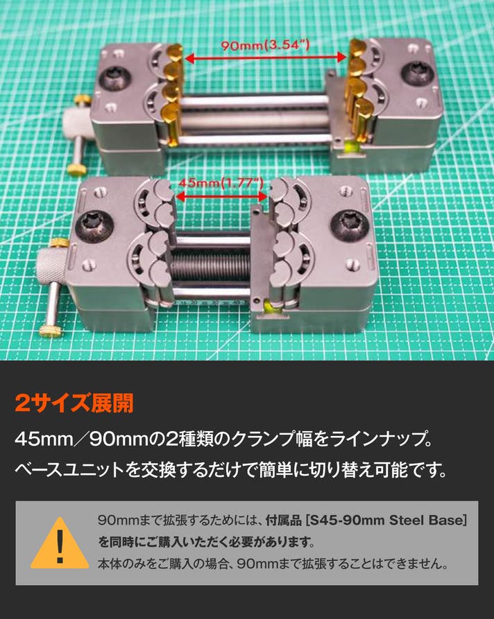 A:90mmまで拡張するためには、付属品[S45-90mm Steel Base]を同時購入いただく必要があります。本体のみをご購入の場合、90mまで拡張することはできません。