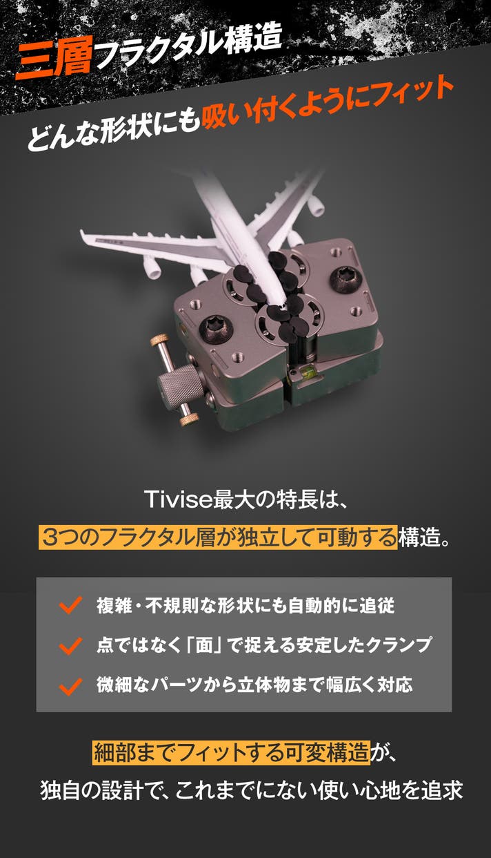 「Makuake(マクアケ)」は、実行者の想いを応援購入によって実現するアタラシイものやサービスのプラットフォームです。このページは、 プロダクトカテゴリの 「三層フラクタル構造で、どんな形状も自在にホールド!クランプ式バイス」プロジェクト詳細ページです。