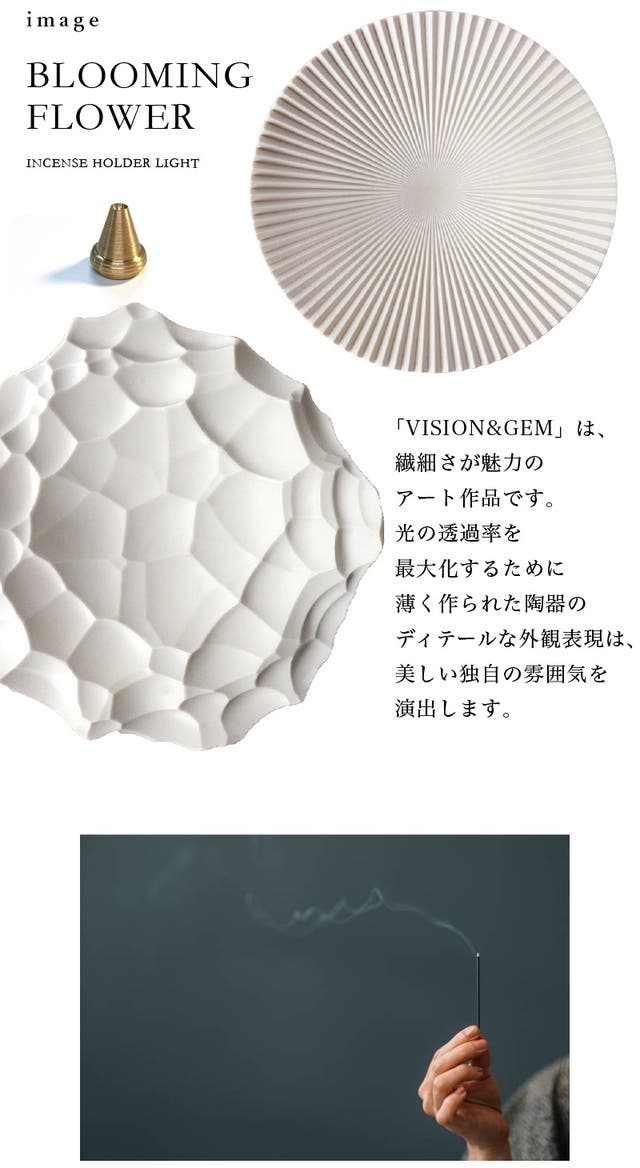 「VISION & GEM」のインセンスホルダームード灯は、従来のムード灯とインセンスホルダーの機能が結合されて誕生した新概念の製品です。 光を透過する材料的特性を活用した陶磁器ムードなどとメタルで作られたインセンスホルダーの組み合わせは、一つの高級な芸術に仕上がります。 花の美しい姿からインスピレーションを受けて誕生したムードなインセンスホルダーは、香りと光の新しい経験を提供し、オブジェとしても独特の雰囲気を演出します。
