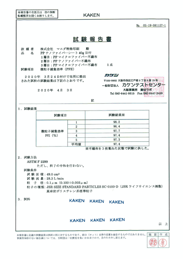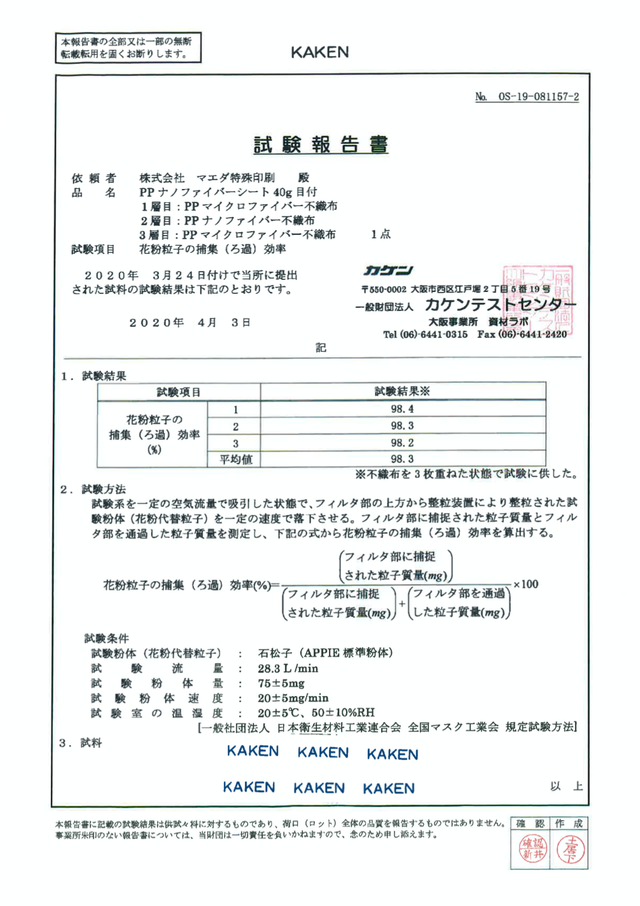 ナノファイバーの微粒子捕集効率(PFE)テストでは平均97.4%、花粉粒子の捕集効率のテストでは、平均98.3%と高い捕集性能となっています。