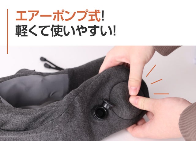 エアー温熱ネックピローは、軽量で気軽に使える温かい温熱機能を搭載したエアーポンプ式ネックピローです。