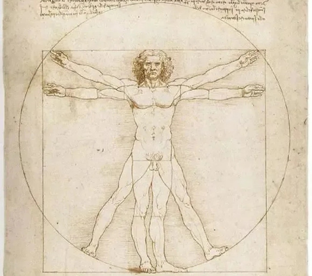 ダ・ヴィンチが1490年頃に描いた「ウィトルウィウス的人体図」は、裸体の男性の両手脚が異なる位置に重ねられ、外周に描かれた真円と正方形に内接した構図となっています。「人体の調和」とも呼ばれ、現代でも医学のシンボルとしても広く用いられています。
