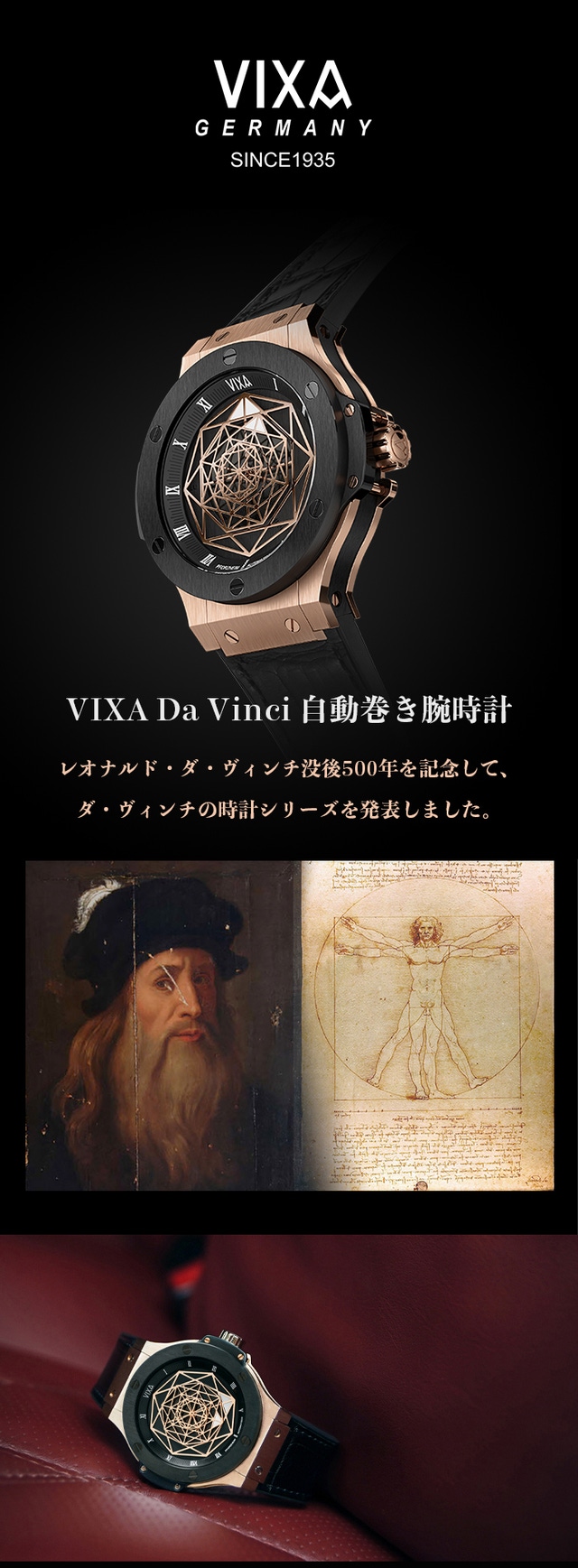 「VIXA Da Vinci 自動巻き腕時計」は、ダ・ヴィンチの知性と輝きを表すシンボル「黄金比」「フィボナッチ」「ウィトルウィウス的人体図」を中心とした一連の概念を、腕時計のデザインに昇華さた記念モデルです。