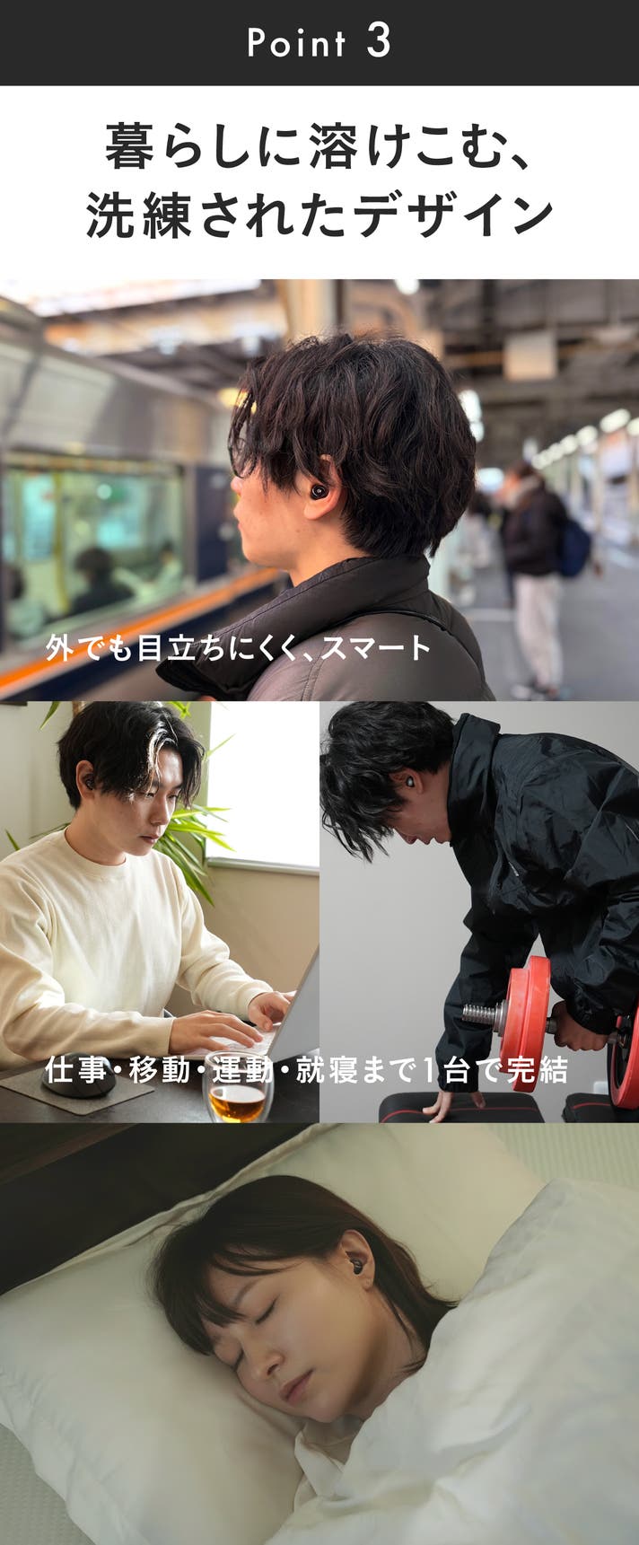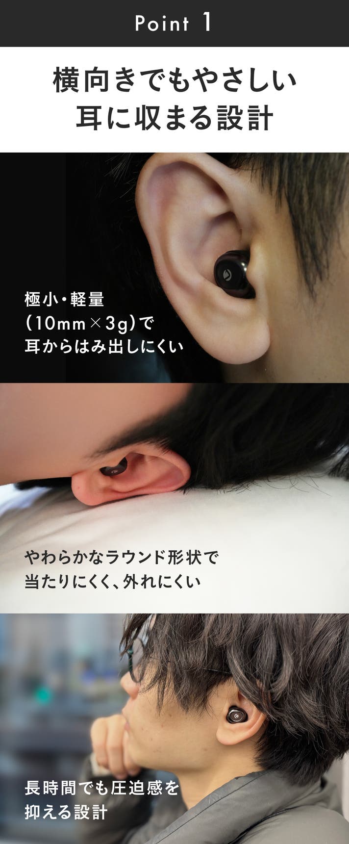 横向きで眠っても耳が痛くならないように、重さを感じない“無重力”のような装着感を追求。