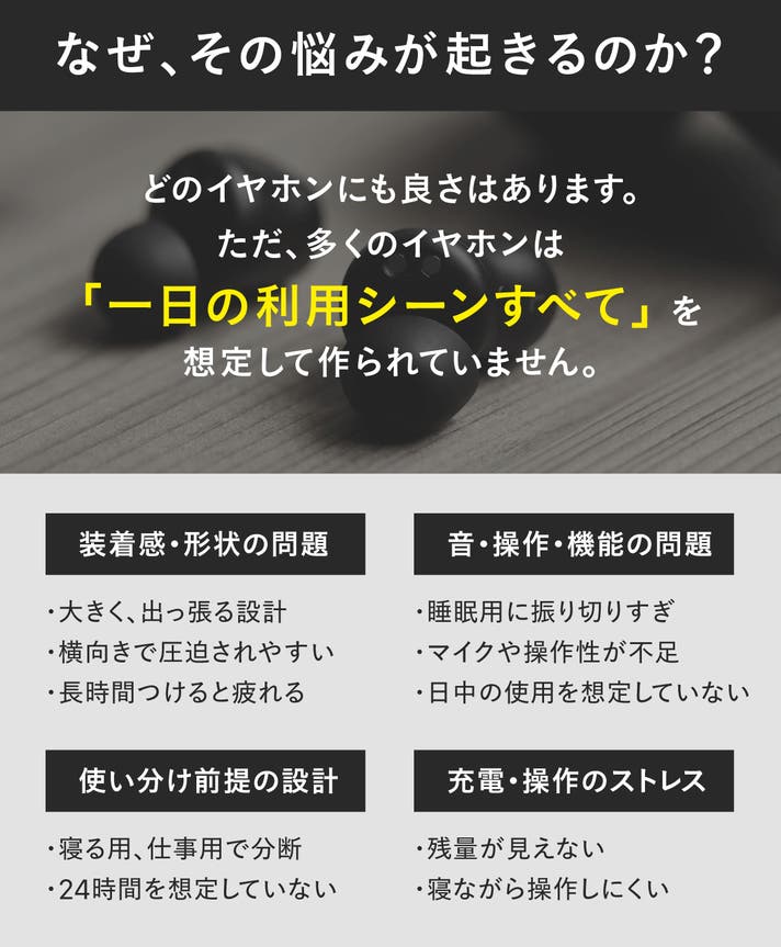 「Makuake(マクアケ)」は、実行者の想いを応援購入によって実現するアタラシイものやサービスのプラットフォームです。このページは、 プロダクトカテゴリの 「【たった10mm×3g】つけっぱなしでも上質な音|寝ても起きても使えるイヤホン」プロジェクト詳細ページです。
