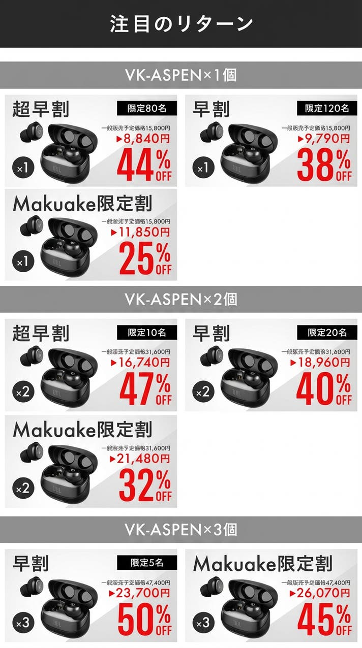 【MAKUAKE特別限定割・32%OFF!】VK-ASPENイヤホンセット×2