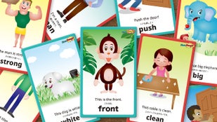 取り手:床に散らばったカードの中から、"big"の反対の意味の単語を探し、見つけたらカードをたたきながら、“small”と言う。カードを取ったら、