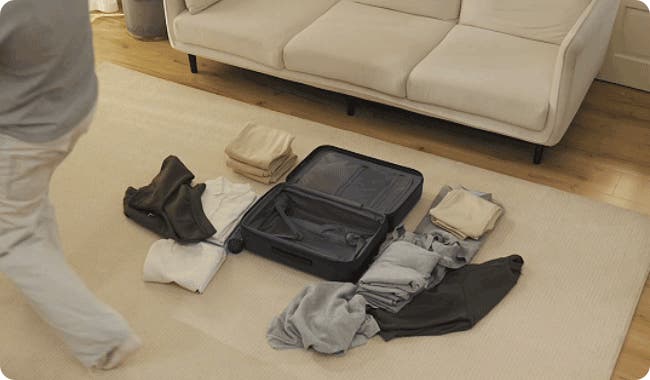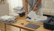 VOLLYC があれば、大きなスーツケースとはお別れ。圧縮した衣類は、機内 持ち込みサイズのスーツケースにもすっきり収納可能。出張でも週末旅行でも、軽や かに移動できます。