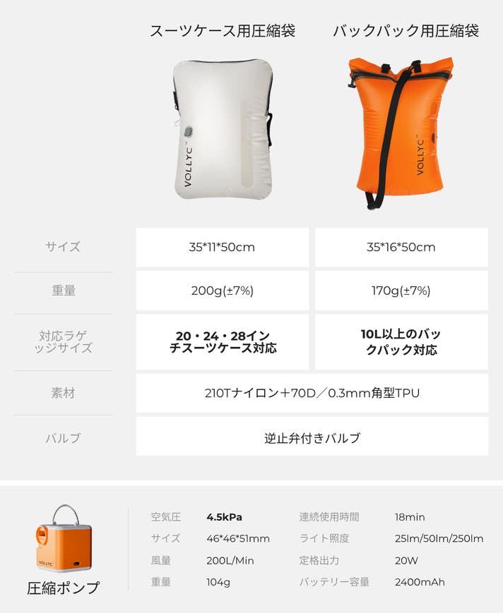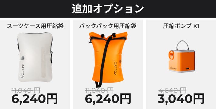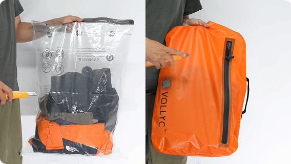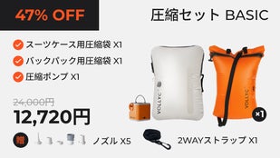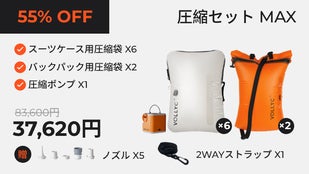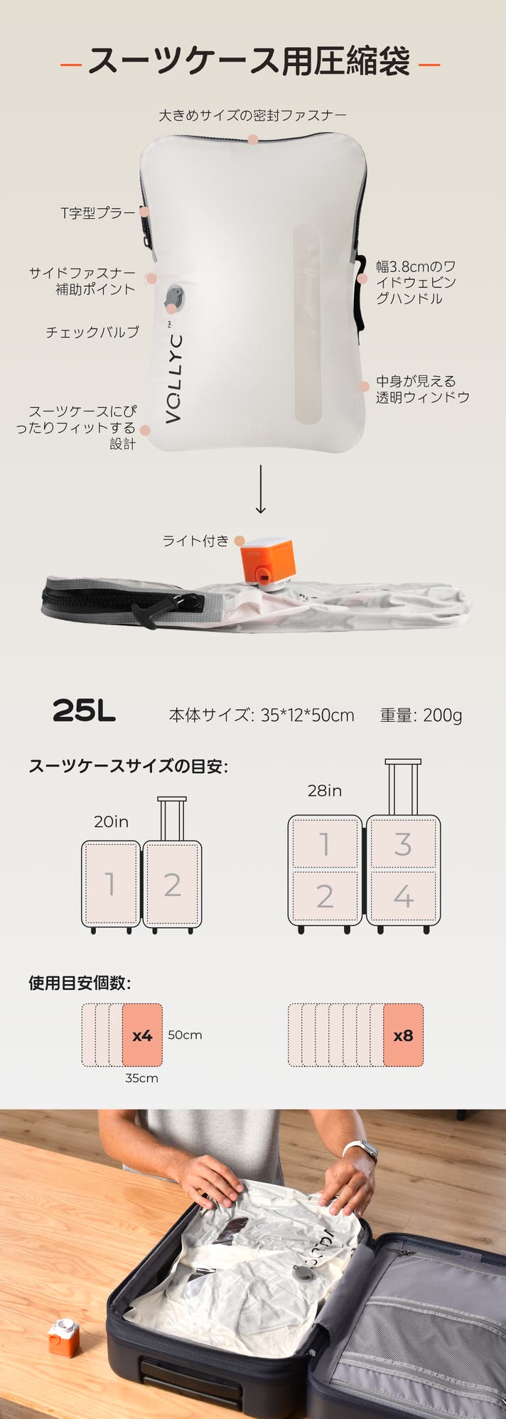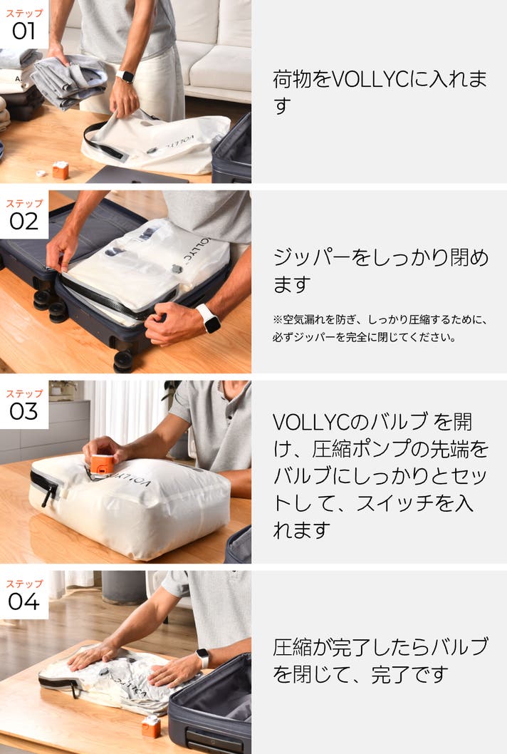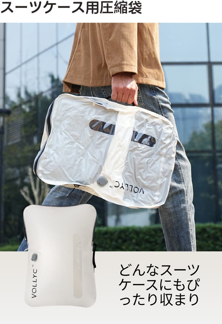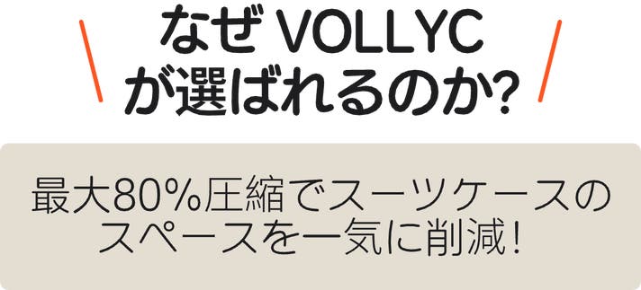 スーツケースのスペースが足りない? VOLLYC なら、容量はそのままに、荷物の体積を最大80%圧縮。限られたス ペースでも、持って行きたいものをすべて収納できます。