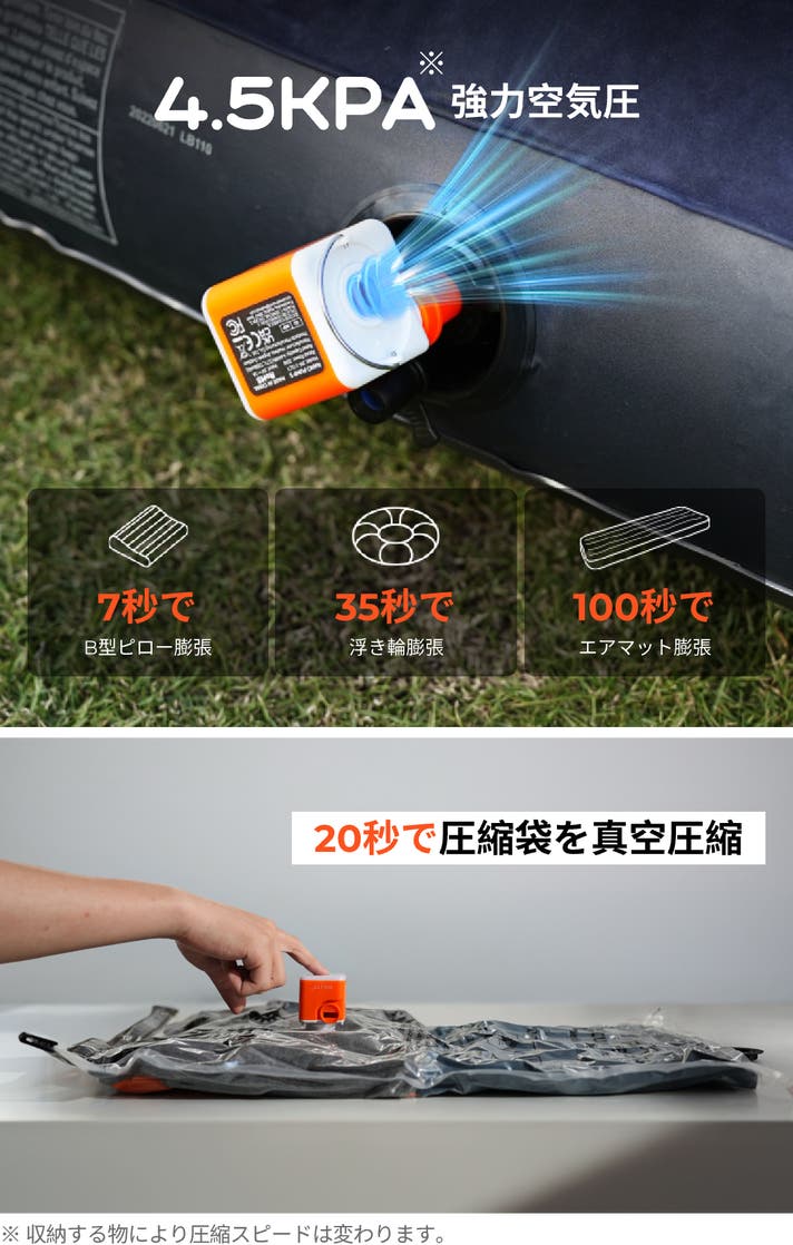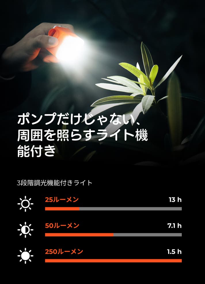 3in1エアポンプで — 空気入れ・空気抜き・ライト機能をひとまとめに。コンパクトながら パワフルで、どんな旅にも対応。