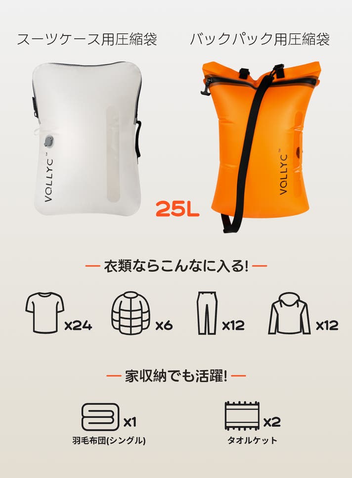 服選びに迷わず、ぜんぶ持っていこう! VOLLYC は大容量設計で、数日分〜数週間分の衣類はもちろん、かさばる冬 服までしっかり圧縮して収納できます。羽毛布団やブランケットなど、かさばる寝具 の保管にも活躍します。