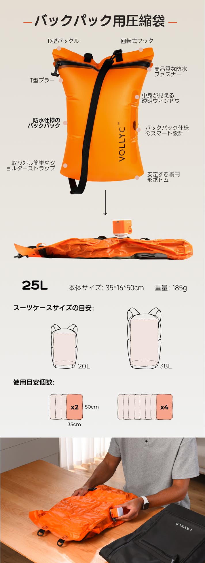 大きめサイズの密封ファスナーにより、VOLLYCは圧縮状態をしっかりキープし、湿 気やホコリの侵入を防ぎます。旅のたびに、長く続く安心を提供します。