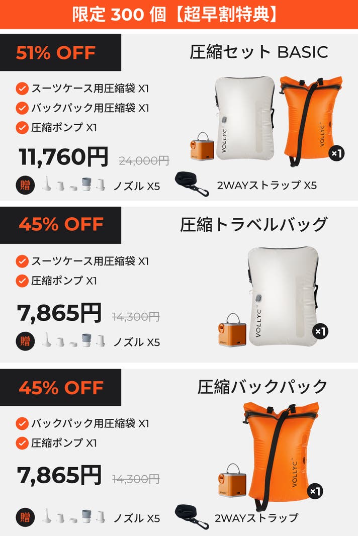 VOLLYC の革新的なデザインで、荷物を最大80%圧縮。収納スペースはなん と3倍に!