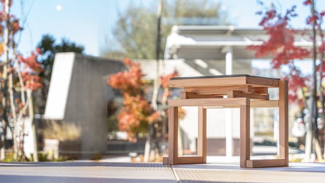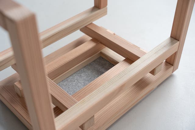 福島県楢葉町の自社工場にて、福島県産の「常磐杉」のみを使用して製作しています。また、日本伝統技法である継手と木ダボを用いた “金物を一切使用しない” 接合により強度を出し、細部まで美しいデザインに仕上げました。