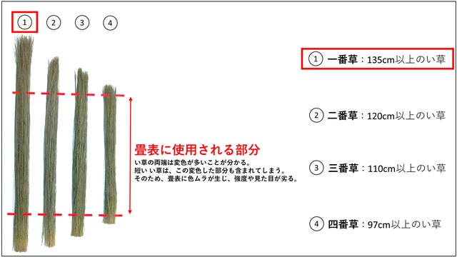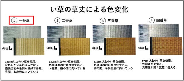 今回、畳の原料になっている天然い草は、最上級品の畳に使用されている「一番草」を使用しています。穂先が枯れていない1番長い い草「一番草」は、経年変化時に畳表に黒筋が出にくく、美しい黄金色に変わることで知られています。