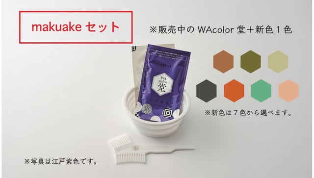 販売中のWAcolor堂1色(5点の付属品:ヘアカラー1剤、2剤、手袋、カップ、ハケ付き)に発売予定の新色×1色選べるmakuake限定のお得なセット。