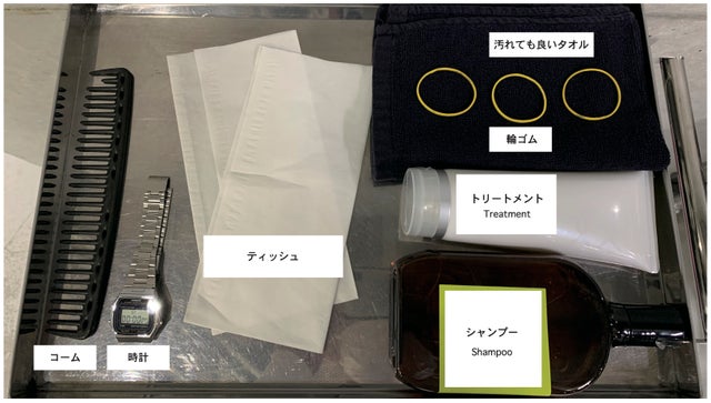 ケープ・クロスまたは汚れても良いタオル、輪ゴム、コーム、鏡、シャンプー、トリートメント、時計、テッシュペッパー