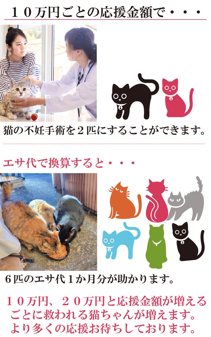 猫は大変繁殖力の強い動物です。一匹のメス猫から増える猫の数は1年後には38匹になると言われています。不妊手術は一匹のうちに迅速に行いましょう。不妊手術をしないと、かわいそうな猫に餌をあげて助けようとした行為が、結果的には不幸な猫を増やすことになります。野良猫の寿命は平均で2〜3年と言われています。不妊手術を施すことで増加を抑制できます。