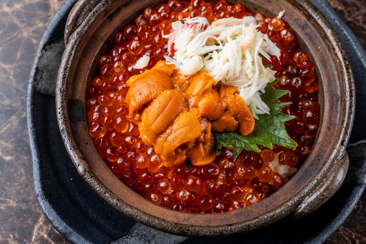 最後に待つのは、蓋を開けた瞬間に歓声が上がる、まさに「海の宝石箱」。うに、カニ、いくらが黄金色に輝く土鍋ご飯です。すべての贅をひと匙に込めて、物語を華やかに締めくくります。