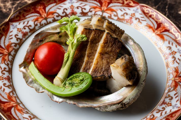 いよいよ物語はクライマックスへ。弾力ある伊勢海老に濃厚なウニを重ねた贅沢な一品と、磯の王様あわびのステーキ。力強い海の旨味が交互に押し寄せ、このコース最大の高揚感へと導きます。