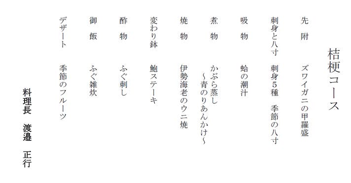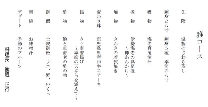 桔梗コースを始め、渡邉の技と素材が饗宴する雅コース。