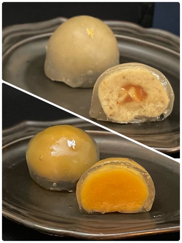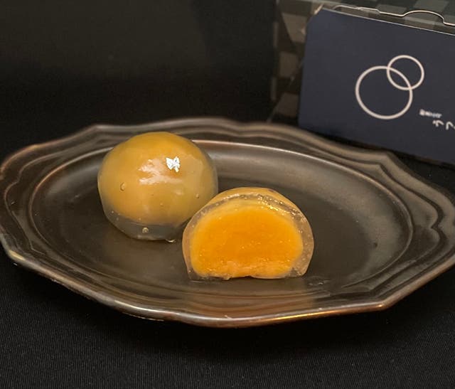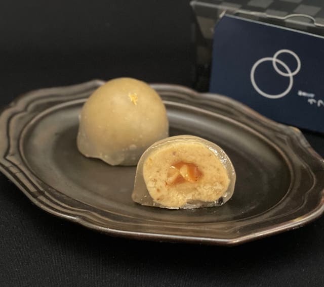 栗きんとんの中に入れ、わらび餅で包んだ御菓子。