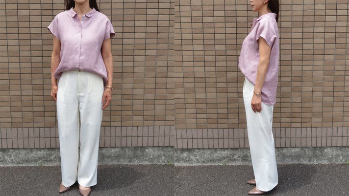 ゆったりとった身幅は体型を隠しながら、前から見るとスッキリとしたイメージに