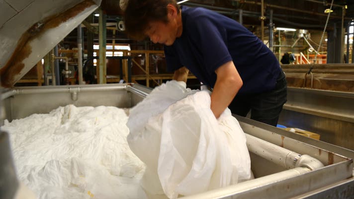 ③生地の取り出し 水分を含んでいるので1反50kg以上の重さがあります。