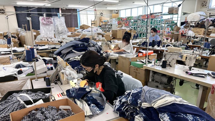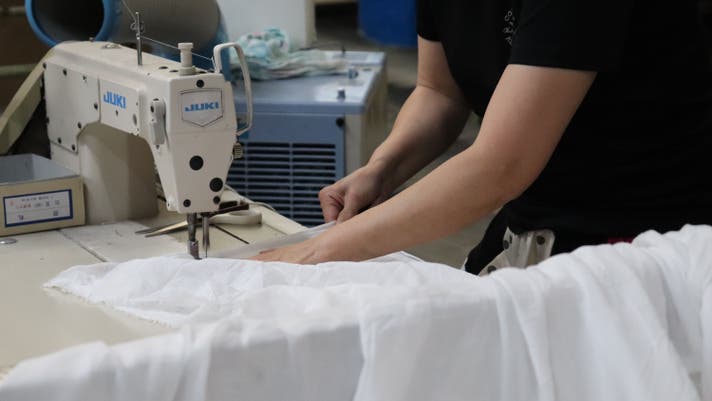 ⑤ミシンで生地を繋ぎ合わせ、その後染めるものは染色に、白のままのものは乾燥~仕上げとなります。和晒しの工程はここまでとなります。