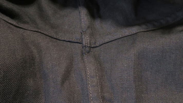 拘りポイント③細部の縫製の拘り 縫製仕様は高級ドレスシャツ仕様。すべて伏せ縫いなので、生地と生地の繋ぎ目が非常に綺麗な仕上げです。肌あたり面の始末も綺麗に仕上げてます。下記写真は、シャツの内側の脇からアームホールの写真です。