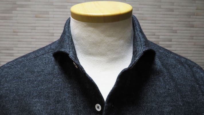 衿元のこだわり シャツの見栄えは衿元にあります。着た時に衿が綺麗に立つシャツは、清潔感もありどのような着こなしでも様になります。今回のシャツは老舗ドレスシャツ工場で、丁寧に縫製し、衿元の収まりにも拘りました。衿のVゾーンが綺麗に見える仕様です。衿の裏側にはカラーキーパーも入れています(差し込み式なので、ご自由に取り外しできます)。
