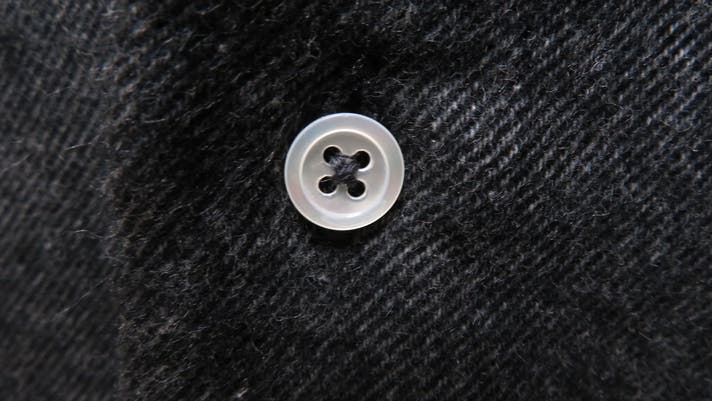 天然の釦 釦は高級ドレスシャツでも使用される天然の貝釦を使用。ナチュラルなシルキーさが魅力。