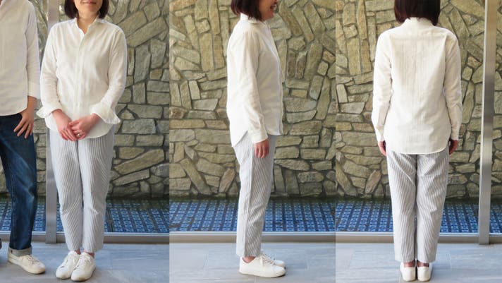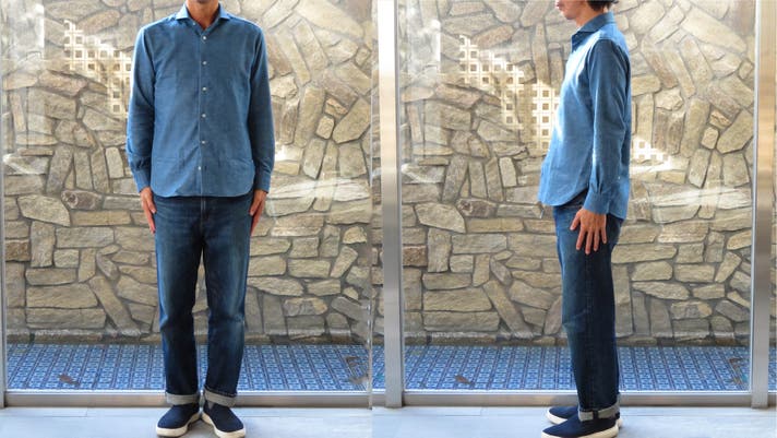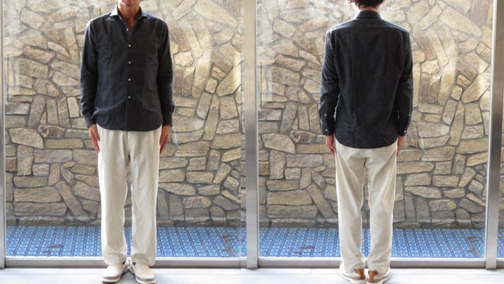 拘りの着丈感 着丈感にも拘りました。パンツアウトでの着こなし時に着丈が長すぎず、またパンツインしてもシャツが出てこないような丈感に設定しました。