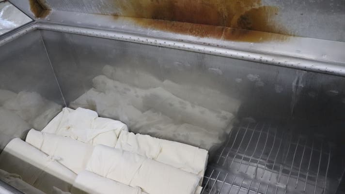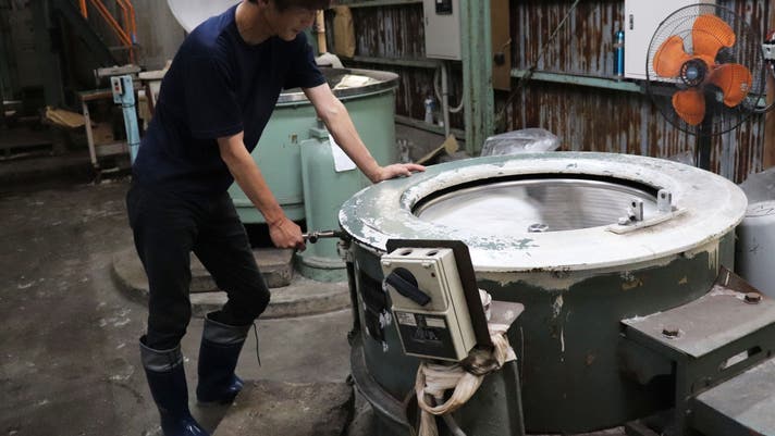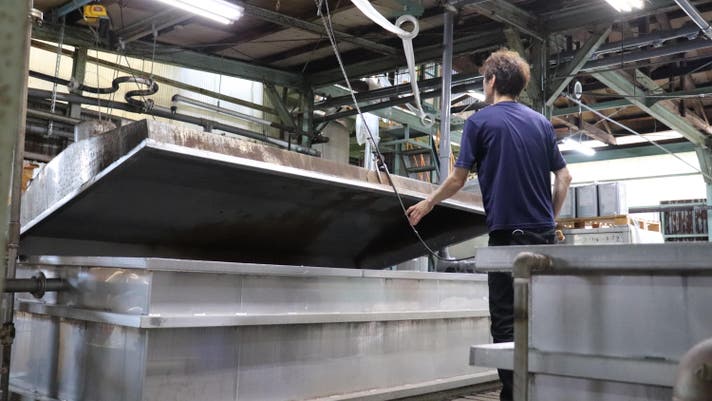 ③生地の取り出し 水分を含んでいるので1反50kg以上の重さがあります。