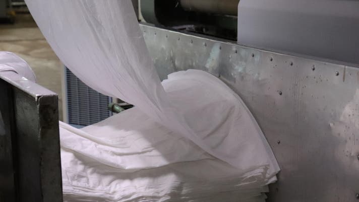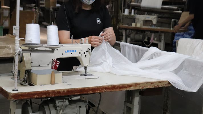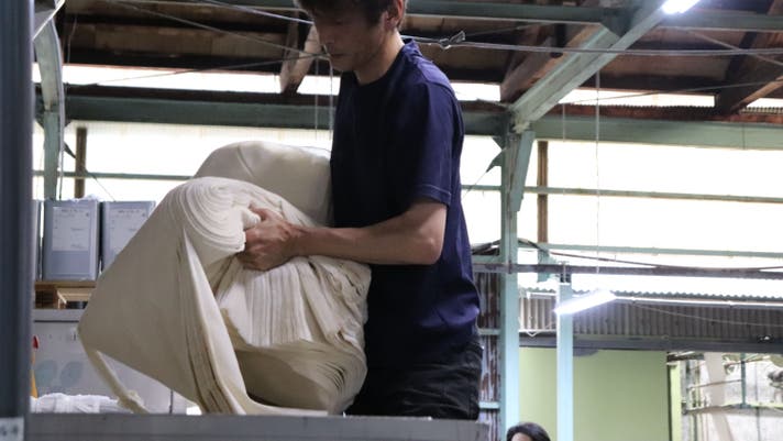 ⑤ミシンで生地を繋ぎ合わせ、その後染めるものは染色に、白のままのものは乾燥~仕上げとなります。和晒しの工程はここまでとなります。