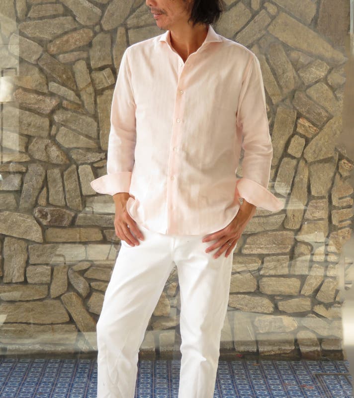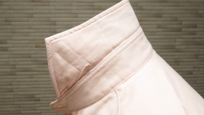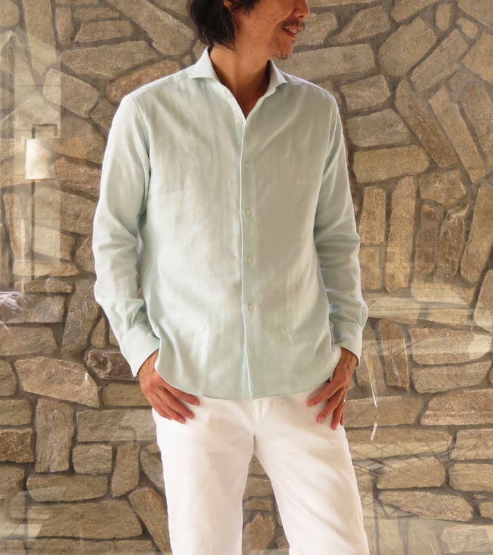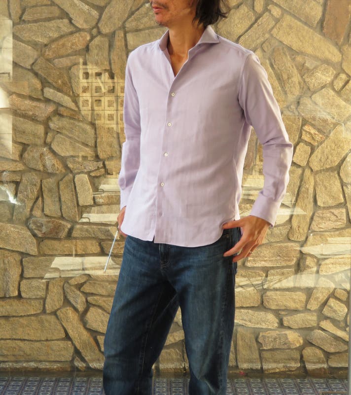 拘りポイント②シャツの顔である衿元への拘り シャツの見栄えは衿元にあります。着た時に衿が綺麗に立つシャツは、清潔感もありどのような着こなしでも様になります。今回のシャツは老舗ドレスシャツ工場で、丁寧に縫製し、衿元の収まりにも拘りました。衿のVゾーンが綺麗に見える仕様です。衿の裏側にはカラーキーパーも入れています(差し込み式なので、ご自由に取り外しできます)。