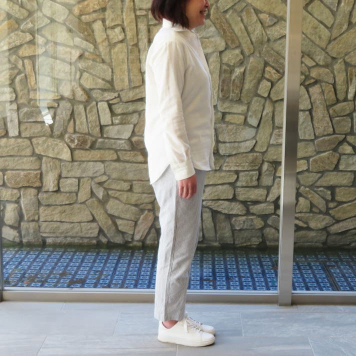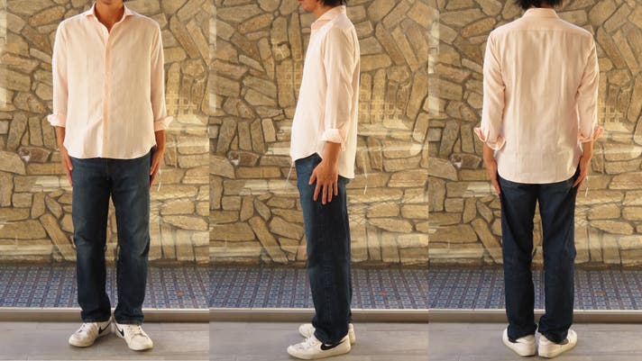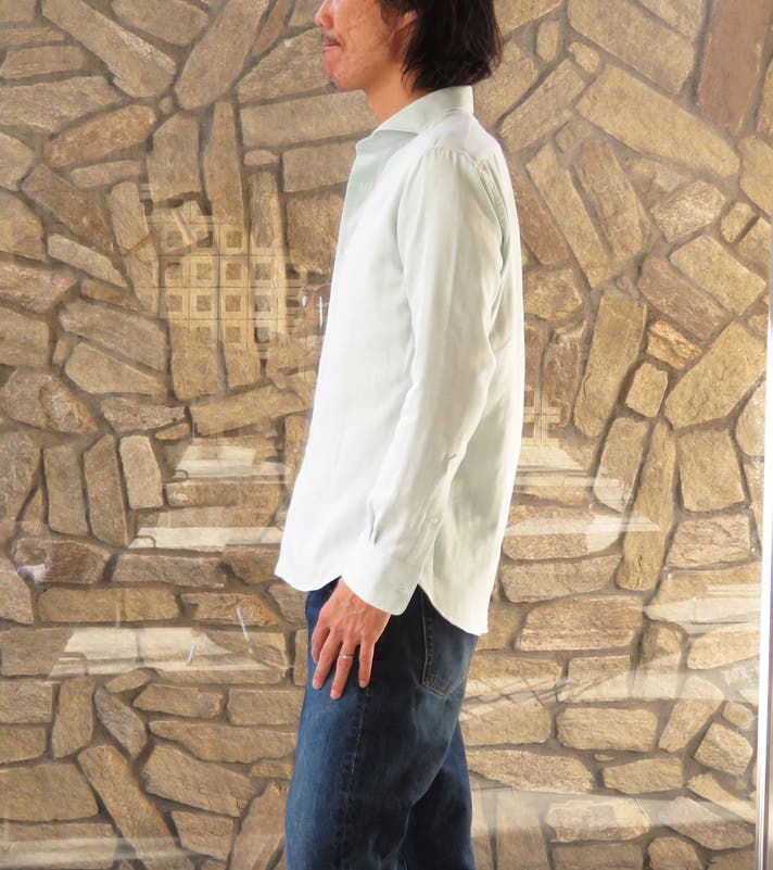 拘りポイント⑤着丈の長さ 着丈感にも拘りました。パンツアウトでの着こなし時に着丈が長すぎず、またパンツインしてもシャツが出てこないような丈感に設定しました。