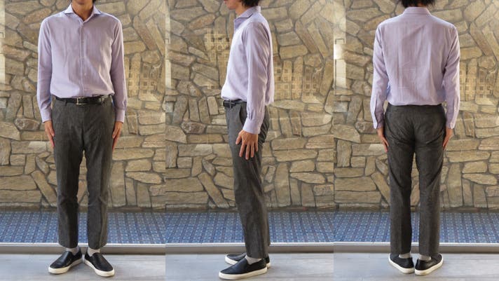 シルエットにも拘り、弱冠細目のシルエットです。ゆったり着用頂きたい方はワンサイズ上のサイズをお奨めします。