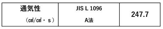 通気性は1秒間に1㎠に何ccの空気が通るかを測定します。一般的に1秒間に50cc以上の空気が通れば「通気性がよい」と言われています。その数値の5倍の約250ccの空気が通っています。