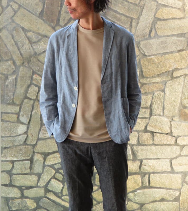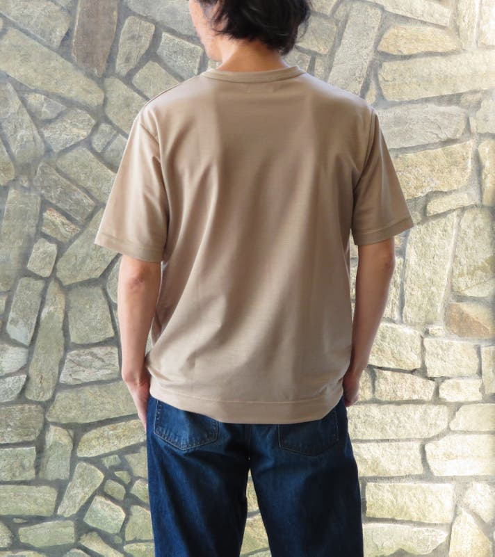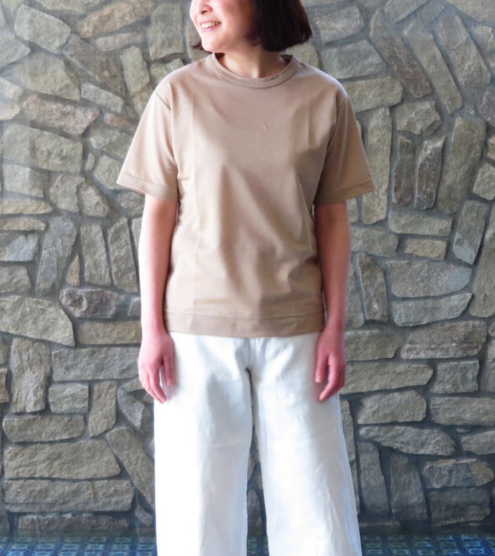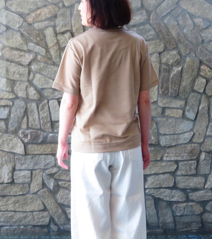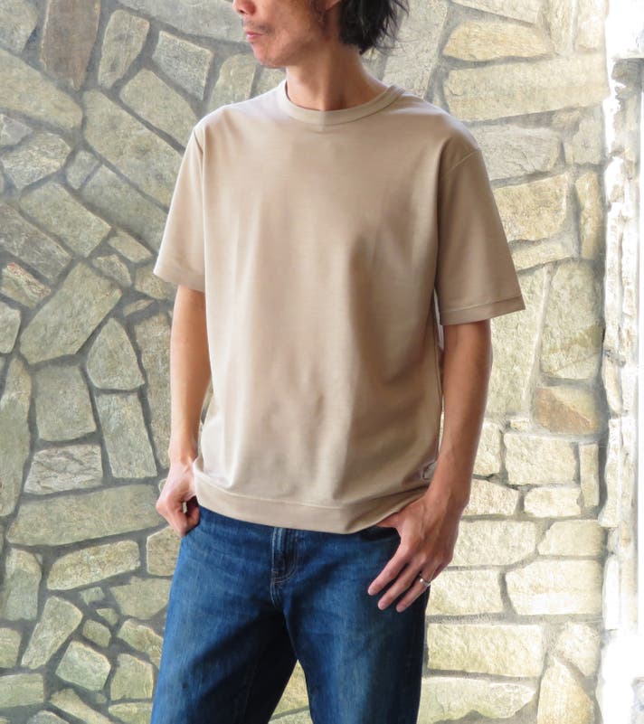 ジャケットに合わせると上品な着こなしに。衿はカジュアルに見えがちなリブを使用せずに共生地を使用したバインダーネック。程よく厚みのある衿元は上品で、ジャケットにも馴染みます。