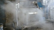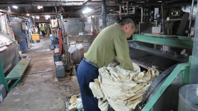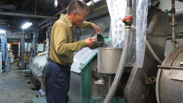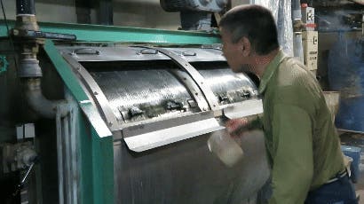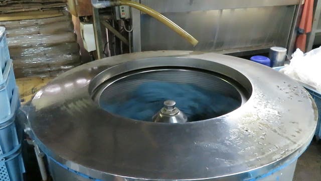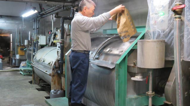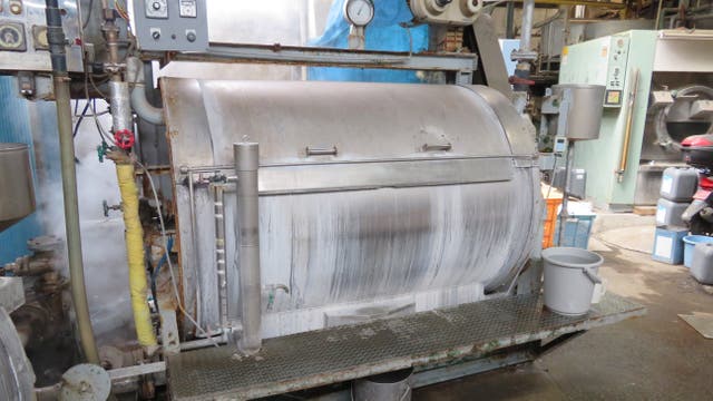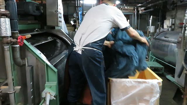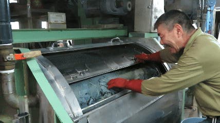 生地を投入する前の下準備です。石灰等の自然物を入れることにより、天然繊維である麻をリラックスできる状態にしていきます。生地をリラックスした状態にすることにより、天然繊維の良さを引き出す効果があります。