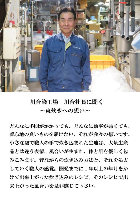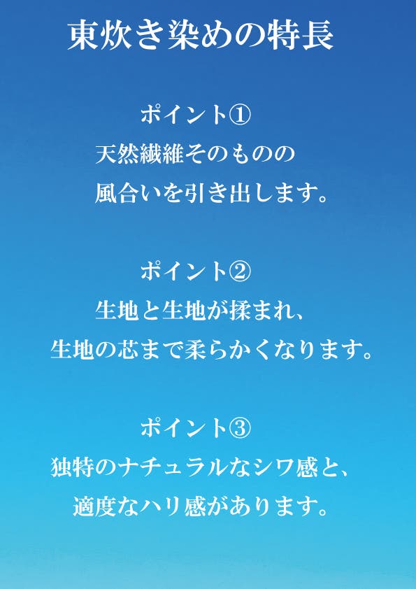 上記3つのポイントをまとめました。ポイント①はとにかく麻との相性が抜群だと思います。麻の風合いとは思えないほど、ハリ感がありながら、とても柔らかい風合いに仕上がります。ポイント②は生地の芯まで柔らかくという表現が、正に適した表現だと思います。生地と生地が揉まれるのと、鉄釜にもあたりながら染色されるので、くったりとした柔らかさが生まれます。ポイント③のナチュラルなシワ感が特長でもあります。麻素材はどうしても、使用時に出来るシワや、洗濯後のシワが気になるのですが、東炊きで染めた生地は、ナチュラルなシワ感があります。このナチュラルなシワ感は染色で出来たシワでとれません。(洗濯後も一緒のシワ感)なので、逆にシワ感が気にならないのも魅力です。