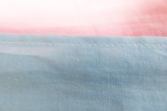 東炊きをした生地は、柔らかくシワ感があるので縫製は難しい生地です。フリンジ部分以外の三巻処理も慎重に綺麗に仕上げていきます。